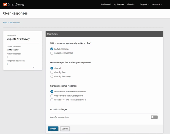 On the My Surveys page within your survey options menu, you can choose to clear responses by selecting which survey responses you want to clear based on the following criteria: