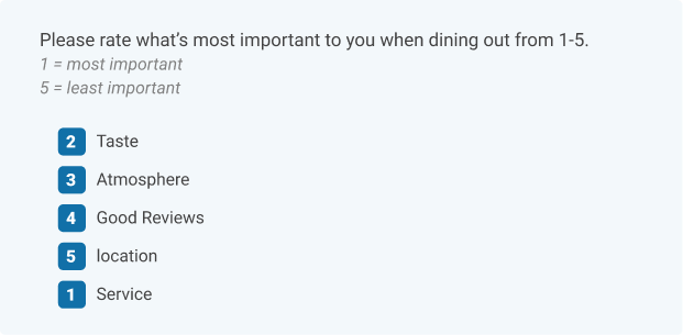 In this example, the researcher would be able to determine which option is most important to customers by adding all the values associated with each option. They could then see which option had the lowest total score – this would be the most important aspect of dining out for the selection of participants that responded.