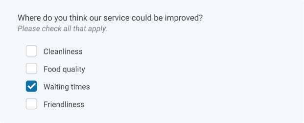 This is where respondents have the option to select the specifics that apply from a list of options. The researcher can then determine how many participants ticked each option and figure out where they should improve on service from there.