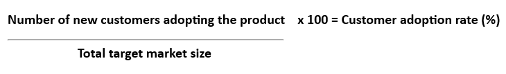 You can calculate your customer adoption rate by dividing your number of new customers who have begun using your product or service over a specified timeframe by the total target market size, then multiplying this by 100 to give you a percentage.