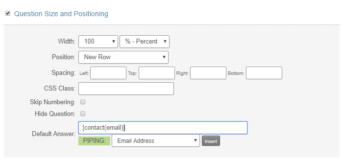You may now be thinking that this is all well and good, but what stops the respondent changing the contents of the answer box, by accident or deliberately? The answer is soft-hiding the question using CSS. This is done in the same set of options where the default answer is defined. There’s a text box called “custom CSS class” and by typing “hidden” in this box, we do a little web magic where the question (and its default answer) is loaded as part of the web page, but not actually shown to the respondent. This of course means that they can’t change it, but it will still be submitted when the page is completed.