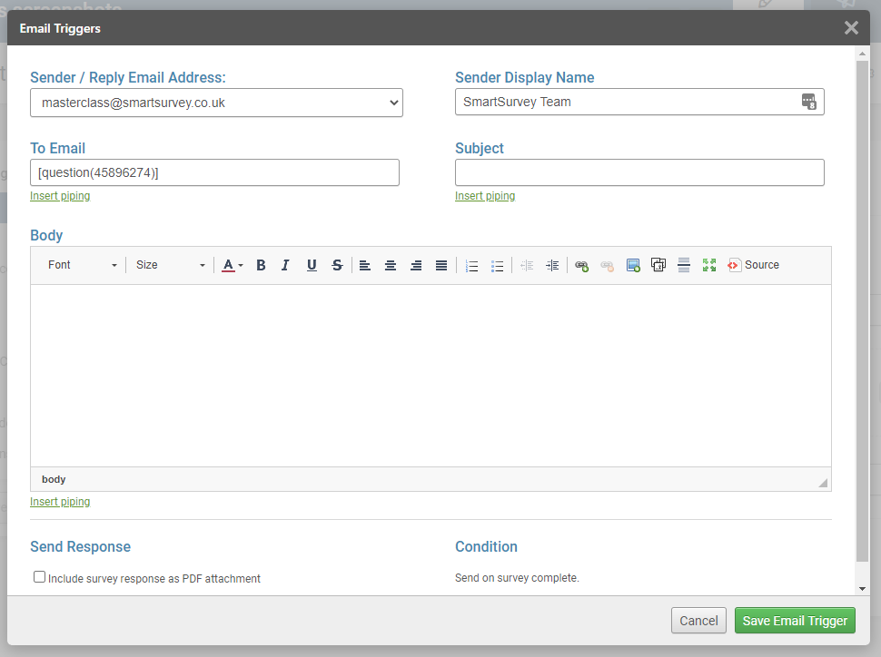 Another useful feature is that that you can use piping to populate the “to” field. If the piping source is an unanswered question, or one that’s not shown to the respondent, the field will be blank.
