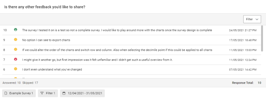 From the use of visualisations like bar charts, column charts, pie charts, line graphs, trend charts and key metric gauge charts, to features like filters and date ranges that enable you to manipulate your data and quickly get to what you need. The highly customisable nature of dashboards means they’re an effective way of displaying and interpreting data related to any survey, vertical or industry.