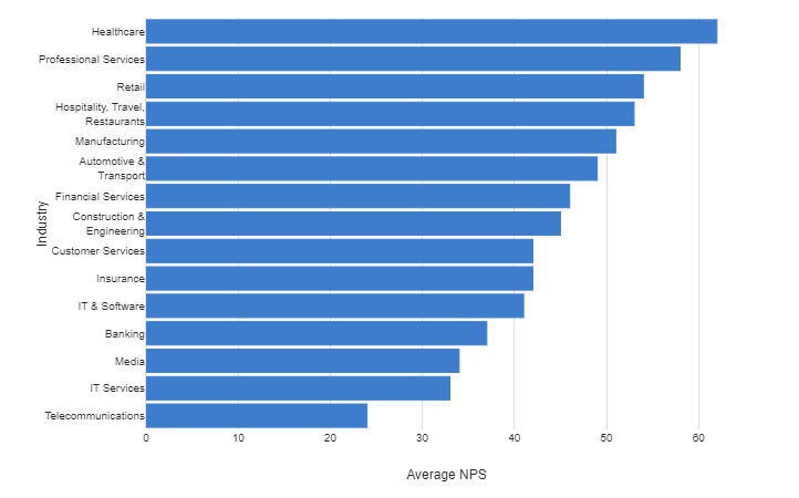 To properly evaluate this graph and assess why some industries appear to have a lower average NPS score than others, you also need to think about the context of that particular industry. This is because some industries can still thrive, even if they provide less than satisfactory customer experiences, due to the way businesses in that sector are set up.