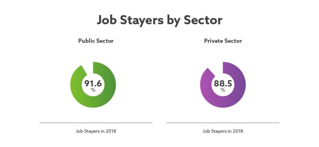 When comparing the private and public sector, we can see that there are small differences between the two and the rate at which workers change jobs. In fact, in 2018 91.6% of public sector employees were in the same job as the previous year, compared to 88.5% of private sector employees.
