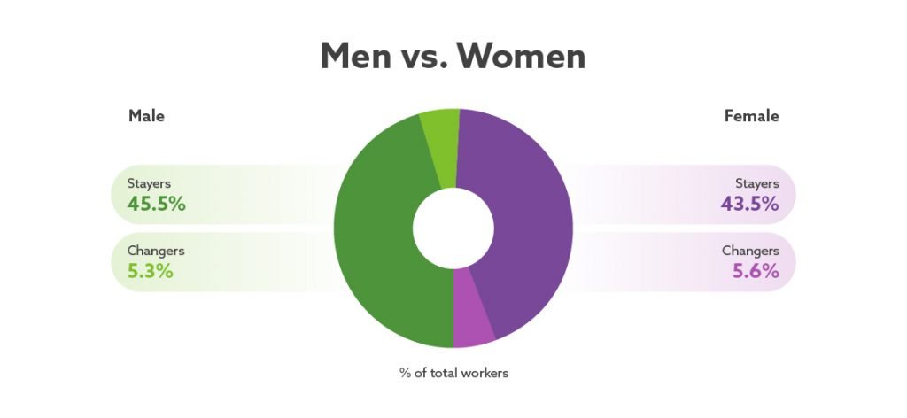 Breaking workers down by gender, we can see a significant difference for men and women in terms of earning potential. While the growth of earnings for those who stayed in their jobs was similar for both genders, men who changed jobs saw a larger increase in earnings than women. For the 2018 figures, the sample included 45.5% male stayers and 43.5% female stayers, indicating that women were changing jobs at a higher rate than men.