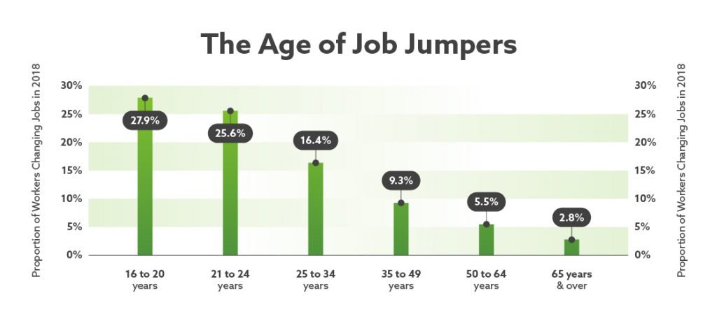 It’s not so surprising that the job market is not full of those aged 50 and over looking for new jobs. In 2018, just 5.5% of workers between the ages of 50 and 64 changed jobs, while those aged 65 and over had just 2.8% of their workers job jumping. At the other end of the scale is the 16 to 20 age group which saw 27.9% of workers changing jobs in 2018.