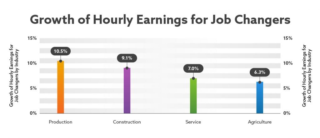 When we break workers down by industry, we can see that those who work in production are much more likely to stay in their jobs, while those in the service industry change jobs far more often. However, it was those in production who actually saw their earnings increase the most when they did choose to change jobs, with an average increase of 10.5% to their hourly earnings.