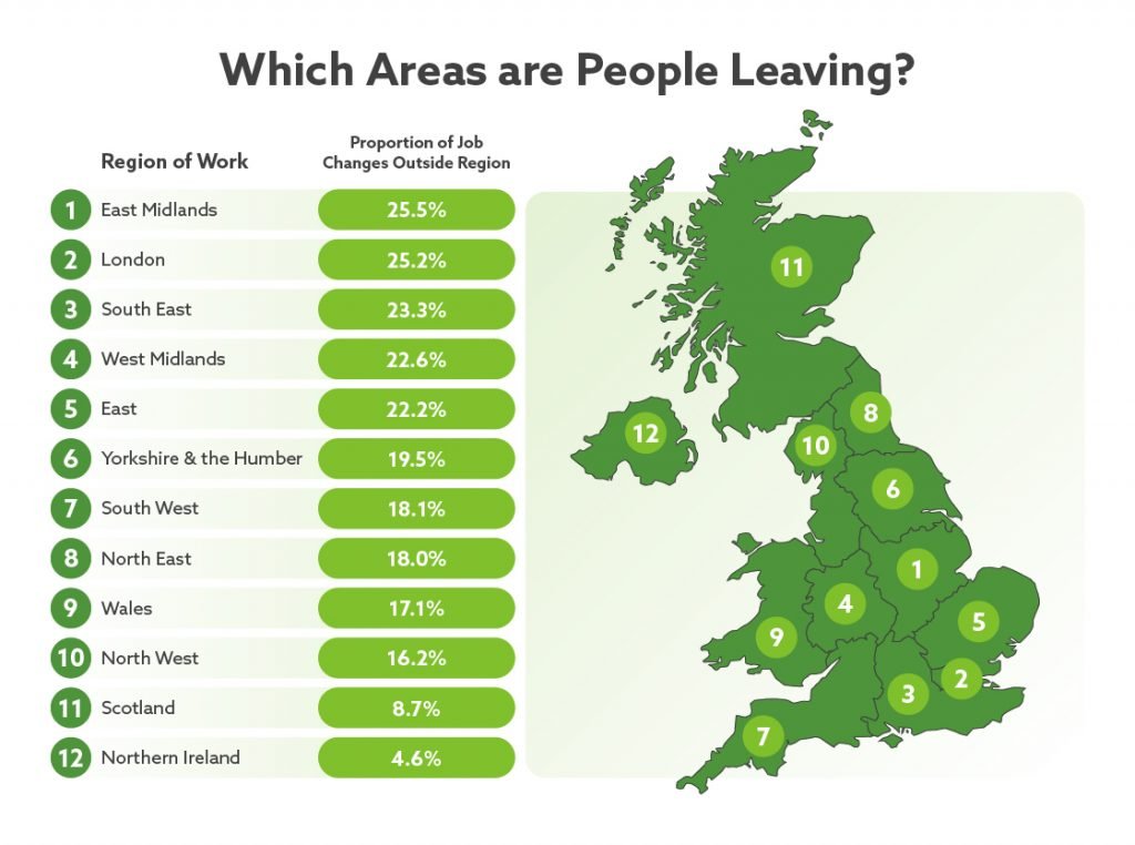 Northern Irish workers are most likely to continue working in their region, with just 4.6% of those changing jobs from 2017-2018 leaving Northern Ireland. The East Midlands region, on the other hand, had the highest proportion of workers leaving the area, with just over a quarter of those changing jobs choosing to move elsewhere.