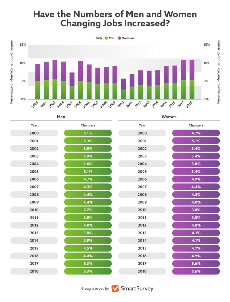 All data is taken from the ONS report – Analysis of Job Changers and Stayers – and features data from years 2000-2018 in the UK.