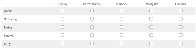 For example, if you operated in the mobile phone industry you might employ a multiple-selection matrix style question as part of your competitor research to find out what features people like about your rivals’ products. In such a scenario, one of your questions could look like the following:
