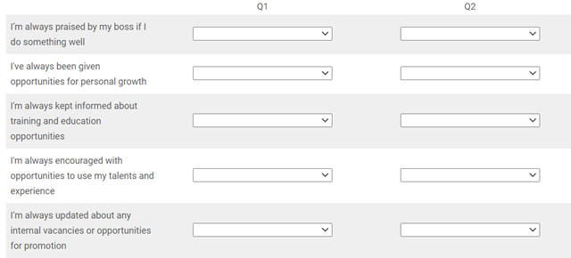 So, if you wanted your staff to comment about these two areas in the first two quarters of your current financial year, a matrix with drop-down menu style question could allow you to present this question to them and rate their answer from ‘strongly agree’ to ‘strongly disagree’ as follows:
