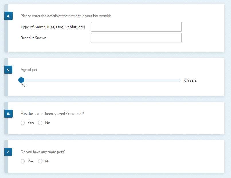 A Census-Style survey for pets that asks for the details of the owner, then those of one pet, then at the end of the form asks if the owner has any more pets. If they say “no”, they are taken to the end of the survey, and if they say “yes”, they are taken to a page for a new pet, and this repeats up to ten times.