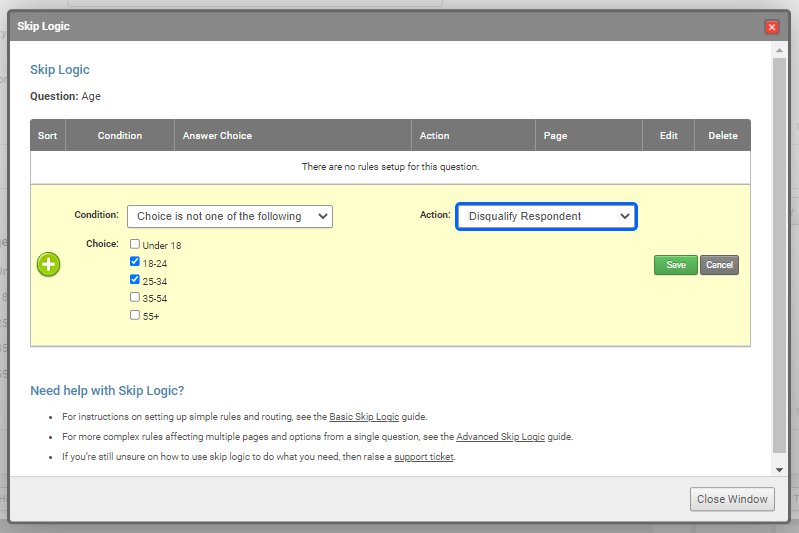 This brings us neatly on to skip logic itself. This is a feature, sometimes referred to as “branching”, where code is added to the survey in the form of rules that apply to specific questions. The rules direct the respondent to pages based on their answers. Taking them to pages with questions we want them to answer, or away from ones that we don’t, or are irrelevant.