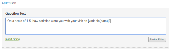 Piping allows us to take this further and integrate this data into the survey content itself. For instance, we can address the respondent by name, turning an impersonal interaction into something a little more conversational, and refer to extra contextual information, like details of items purchased, dates visited, etc.