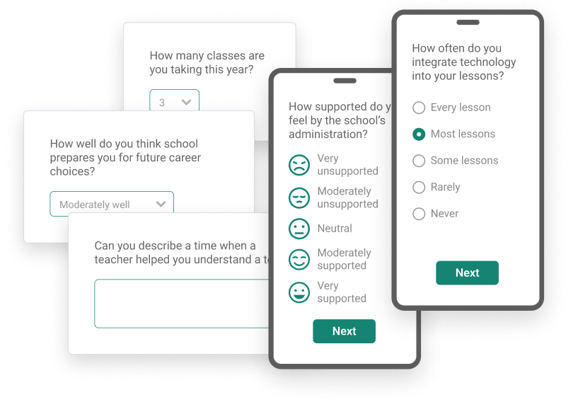 Surveys let pupils express how they feel about their school lives. While one-on-one interviews, observation, or even group discussions can yield similar insights, surveys offer the distinct advantage of speed and anonymity, leading to more candid responses. They can be targeted, tailored, and timed to suit specific purposes and can capture data from a large number of pupils at once.