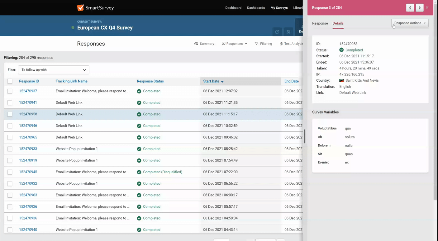 The response table provides an alternative view of your responses, making it easier to view response by status (Completed, Disqualified, Partial and Save & Continue) as well as by group based on filters.