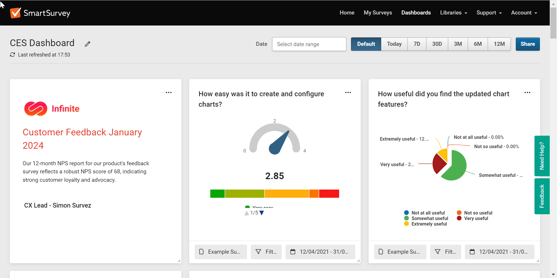 Dashboards in SmartSurvey is a central hub where you can bring your survey data to life. It allows you to: