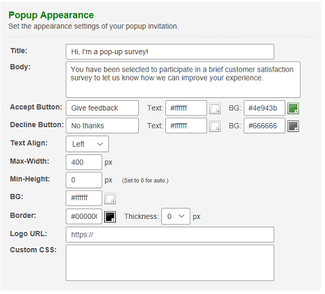 Settings for popup surveys