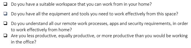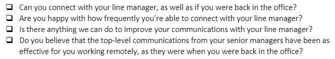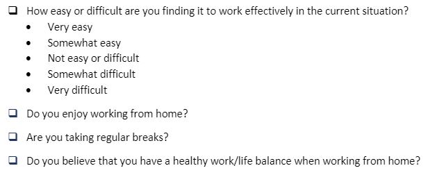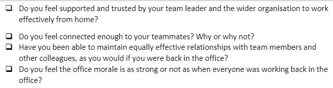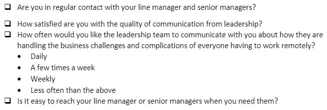 So, to help you here’s some example remote work survey questions to consider using across different areas.
