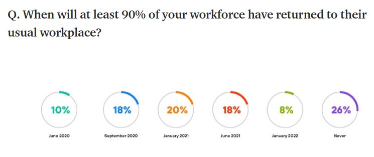 From greater work-life balance and autonomy for employees, to lower running costs and higher productivity for many employers and more. So much so that when the CEOs of the 2020 Fortune list were surveyed back in 2020, with the following question, 26% thought we would never see a return to the office footfall levels of the pre-pandemic workplace.